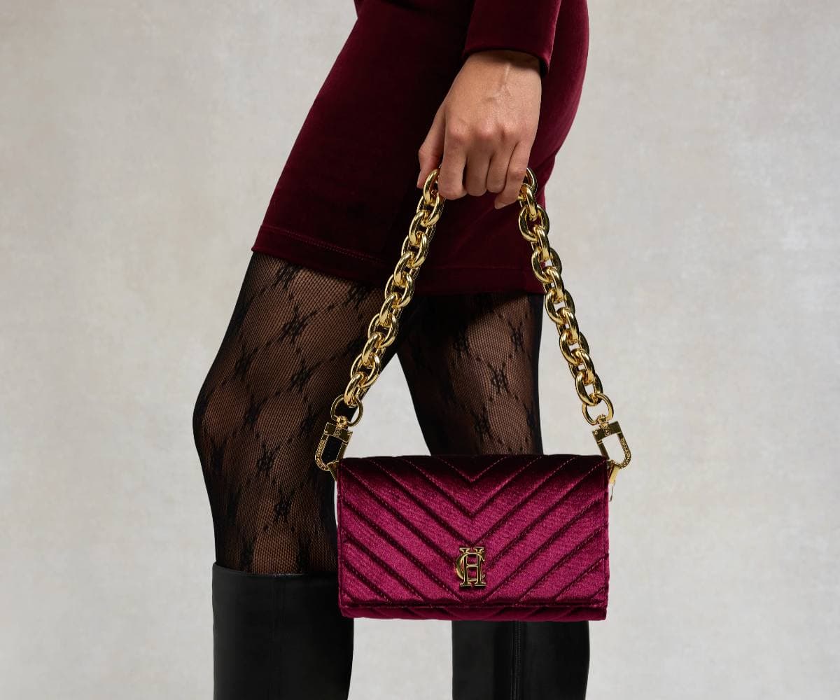 The Belgravia Clutch Bag from Holland Cooper is the epitome of evening elegance. Crafted from rich merlot velvet with a beautiful chevron-quilted design, this statement piece adds a touch of luxury to any look. Finished with a detachable chunky gold oval chain, it can be styled as a clutch or worn over the shoulder for a polished, versatile finish.